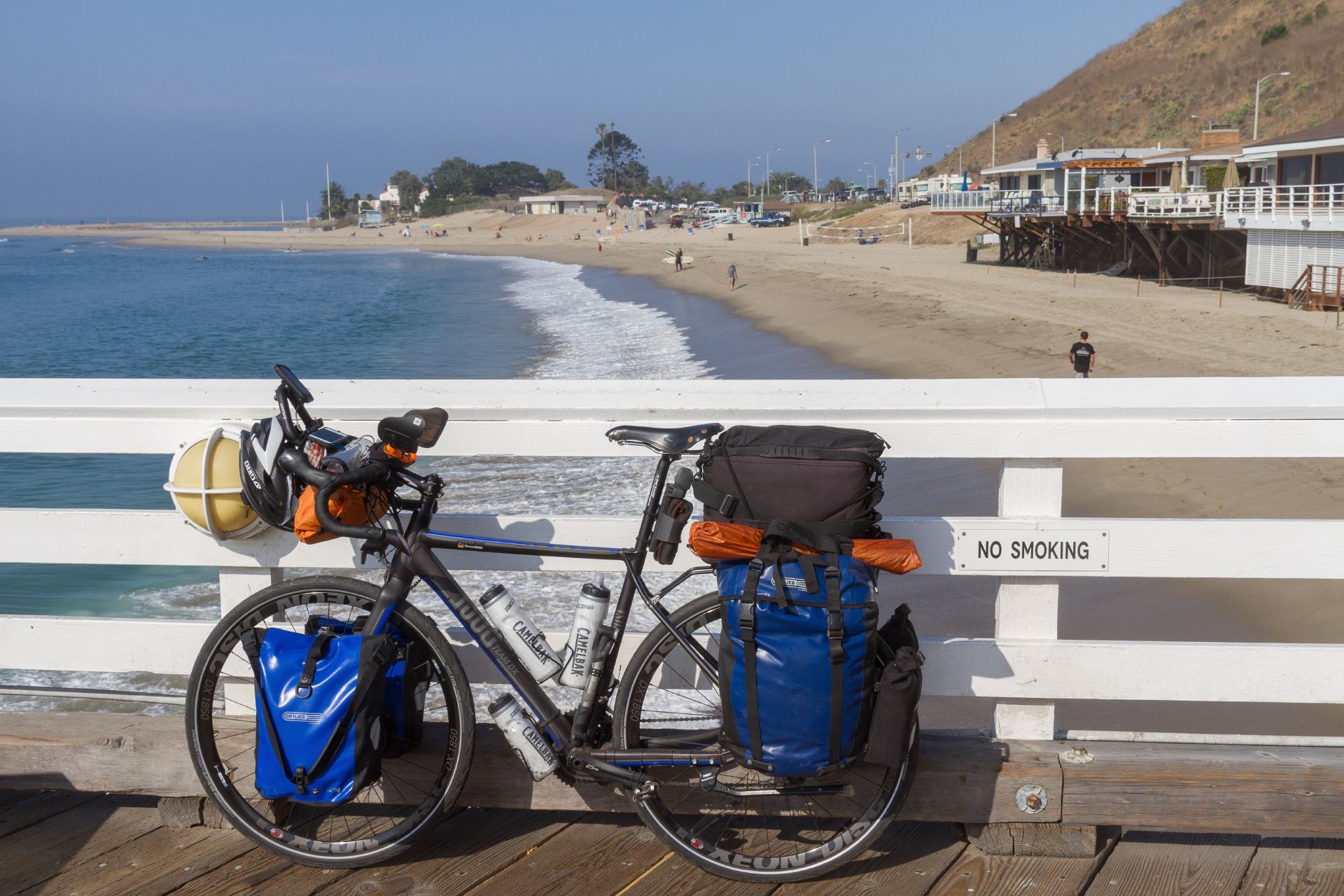 So - heute letzter Radeltag. Zügig habe ich mein Zelt auf dem Leo Carrillo State Park abgebaut und bin wieder auf den Highway 1 gen Süden gestartet. Der heutige Hauptort durch den ich kam war Malibu. Malibu ist aber weniger ein Ort - Malibu ist eher ein 20 Meilen langer Küstenabschnitt mit tollen Stränden und Strandhäusern. Viel Surfer und Beach-Atmosphäre. Auf dem schönen Malibu-Pier machte ich einen Cafe Latte Stop, der wirklich gut war. In Santa Monica angekommen genoss ich dann erstmal in einem Strandcafe den Beach und das Strandleben.