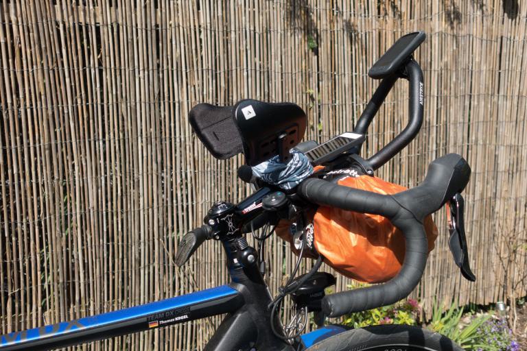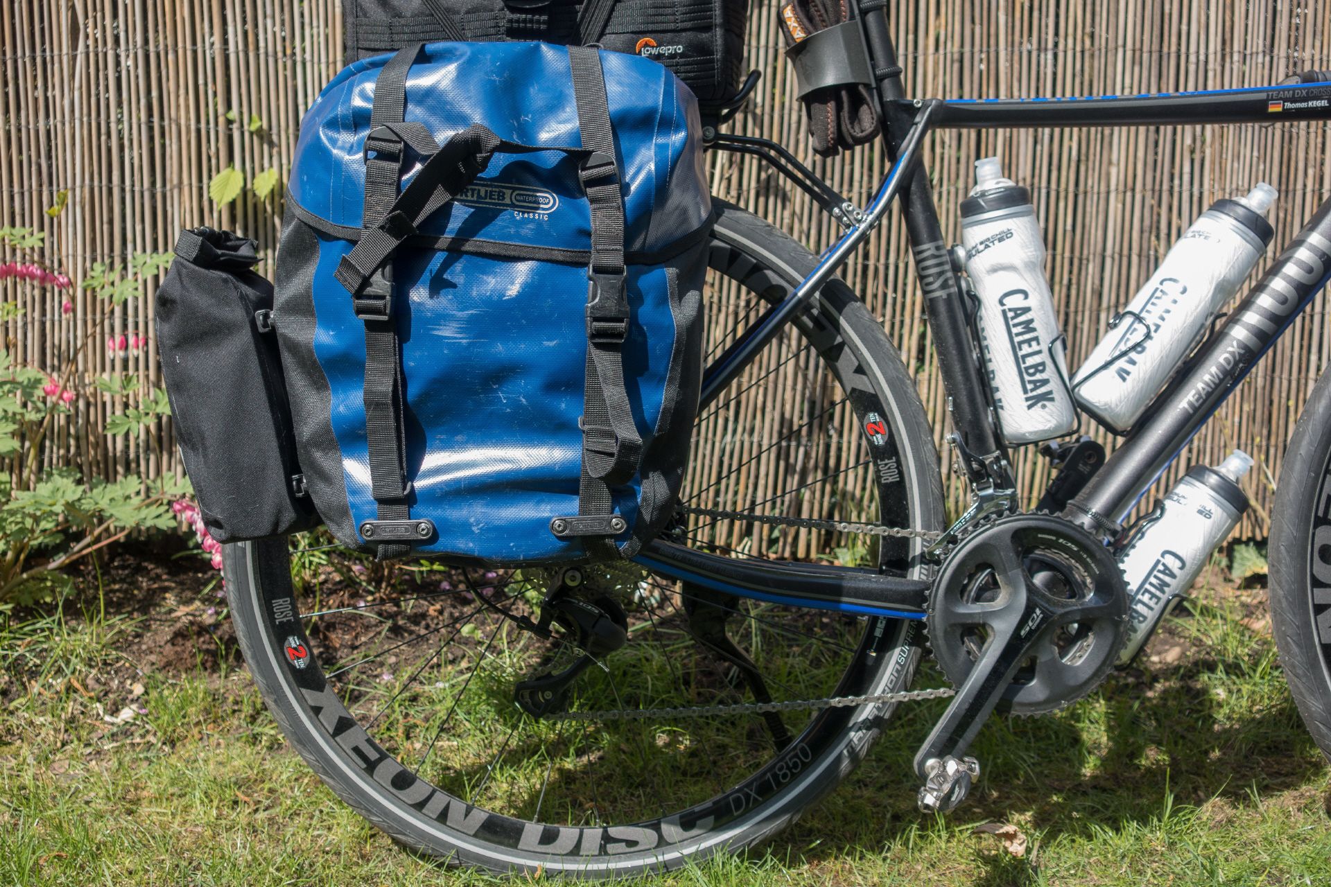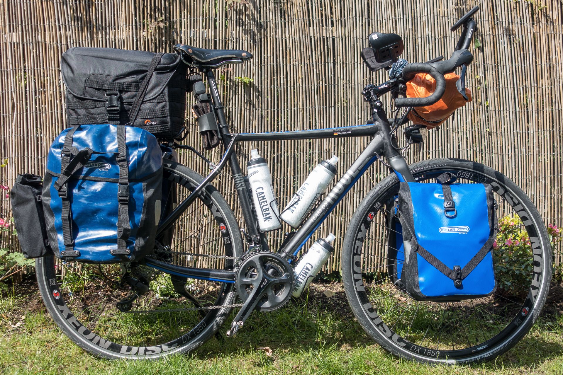 Mein Packkonzept verwendet vier Packtaschen am Rad. Zwei Ortlieb Bikepacker Classic mit Erweiterungstaschen für den hinteren Gepäckträger und zwei Sportroller Classic vorn auf dem Lowrider Gepäckträger. Zusätzlich eine Lowepro Fototasche mit einer Snap-it Kopplung auf dem hinteren Gepäckträger. Am Aerolenker des Fahrrads ist das Zelt angebracht.