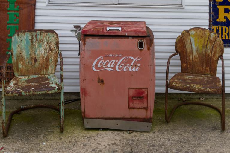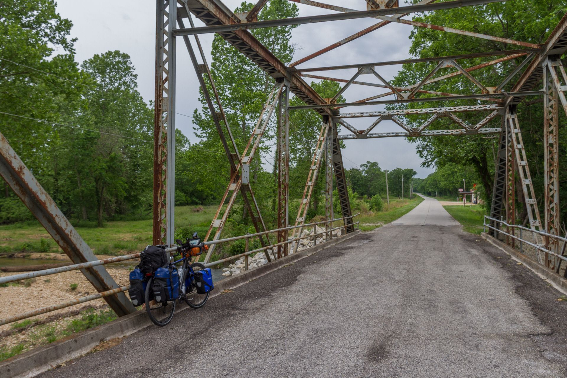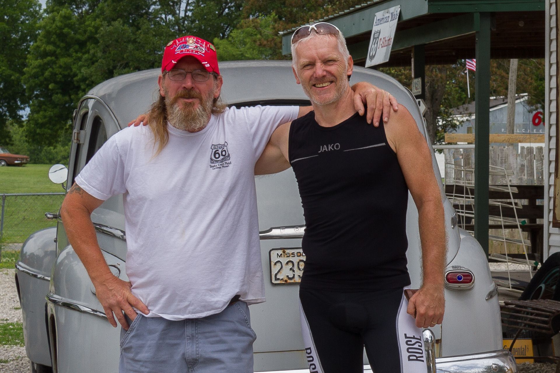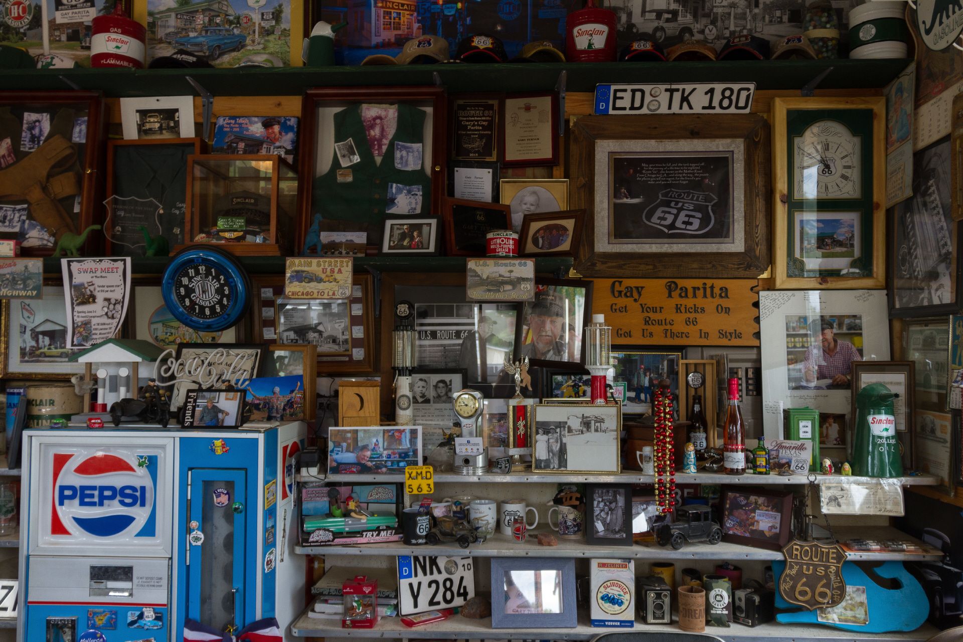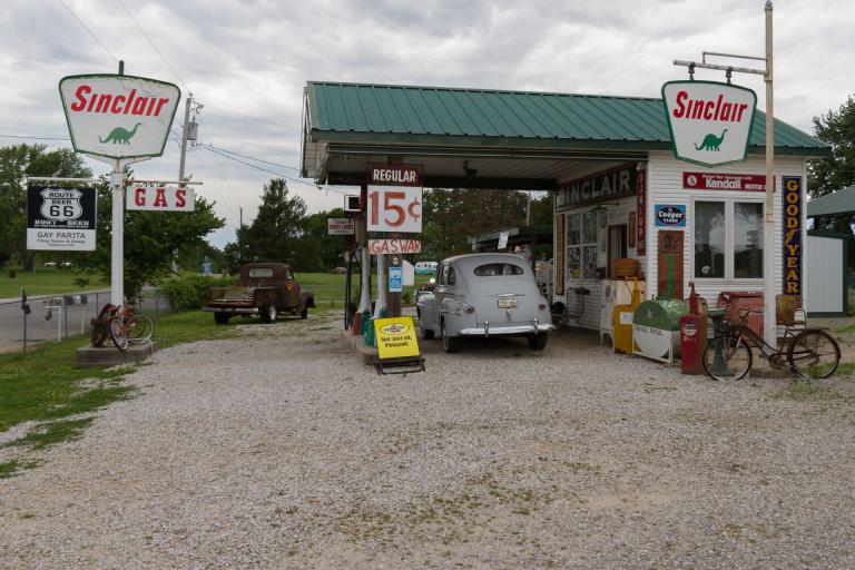 Die hügelige Landschaft setzte sich heute fort. Am Anfang nicht so heiß, kam ich schnell in den "Flow" und erreichte in Paris Spring die alte Sinclair Tankstelle. Dort lernte ich George kennen, der sich zum Ziel gesetzt hatte, alles zu sammeln was irgendwie zur guten alten Zeit der Route 66 gehört. Als Radler wurde ich von ihm auch gleich auf eine Coke eingeladen - das ist bei ihm Tradition.