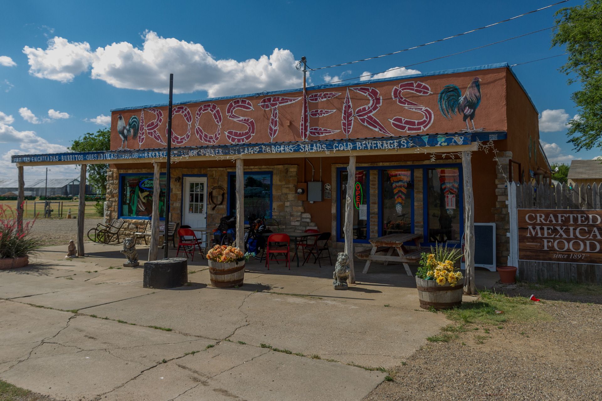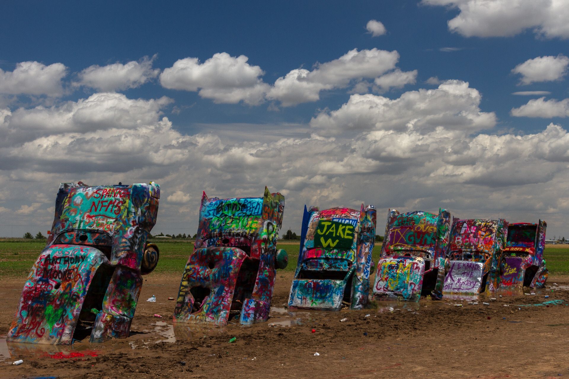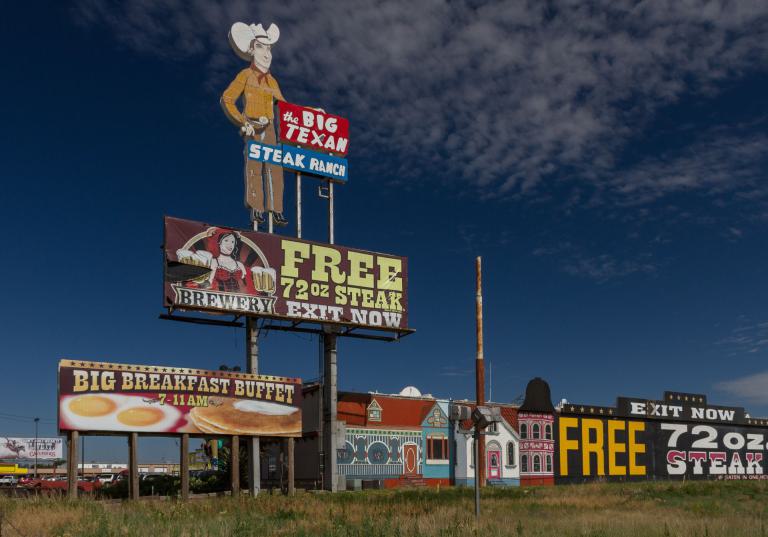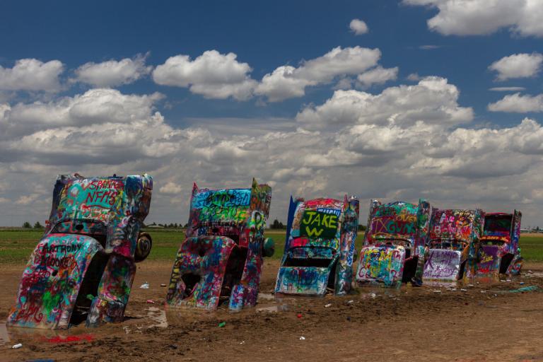 Am Ortsausgang von Amarillo dann der Eyecatcher: die Cadillac Ranch. Diese Cadillacs sind schon seit mehreren Jahrzehnten mit der Schnauze eingegraben und werden immer wieder mit Graffiti neu besprüht. Die nächsten Orte Bushland und Wilderado sind fast ausgestorben. In Vega endlich eine nettes Cafe und Bar. Sonst gibt's nur die ewigen Frontage Roads. Mein Ziel für heute ist Adrian, der "Midpoint of Route 66". Von hier aus ist Chicago und Los Angeles gleich weit entfernt.