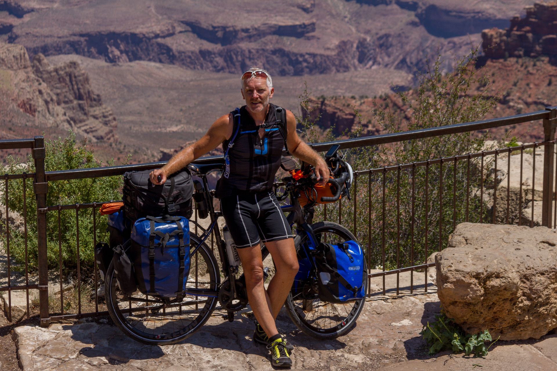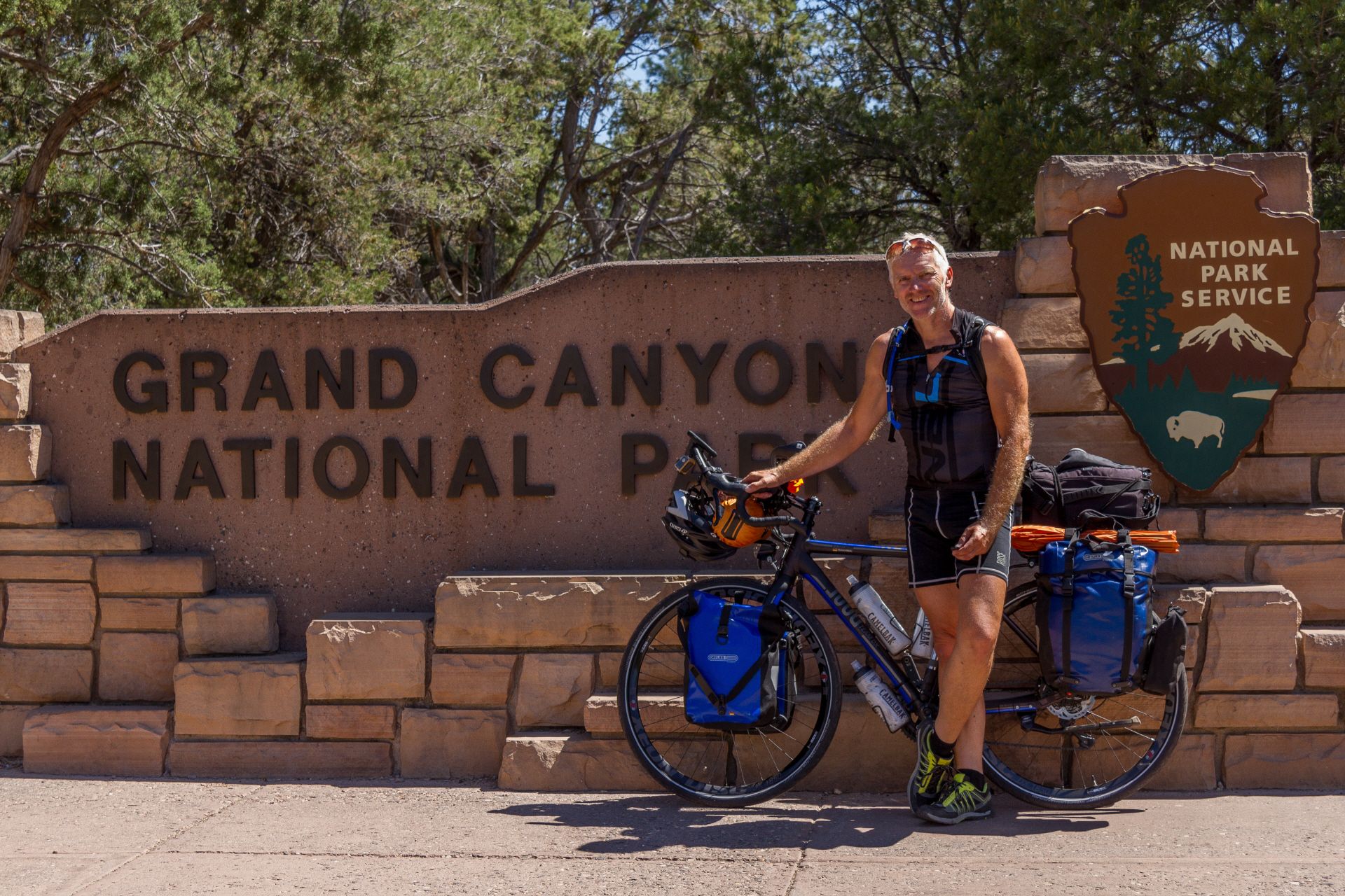 Um 6 Uhr bin ich los. Da ist's noch sehr angenehm kühl. Die Etappe zum Grand Canyon ist meine erste größerer Abseits-Trip von der eigentlichen Route 66. Morgens ist noch wenig Verkehr und die Straße ist auch ganz ok, so dass ich die 90 km bis zum Grand Canyon National Park Eingang doch recht schnell am Vormittag durchziehen konnte. Als erstes - wie in jedem National Park - erstmal zum Visitor Center. Da war aber ziemlich viel los. Deshalb suchte ich den Mather Point auf, um mein verdientes Helden-Foto zu machen. Mit dem Fahrrad am Grand Canyon zu stehen, ja - das hat was.