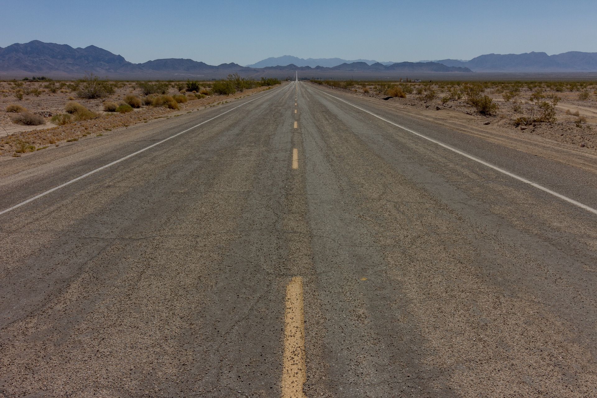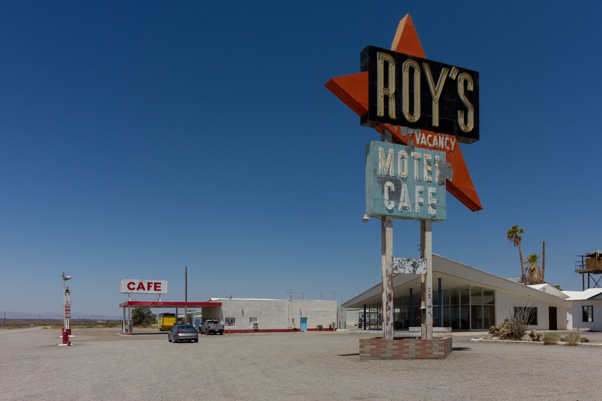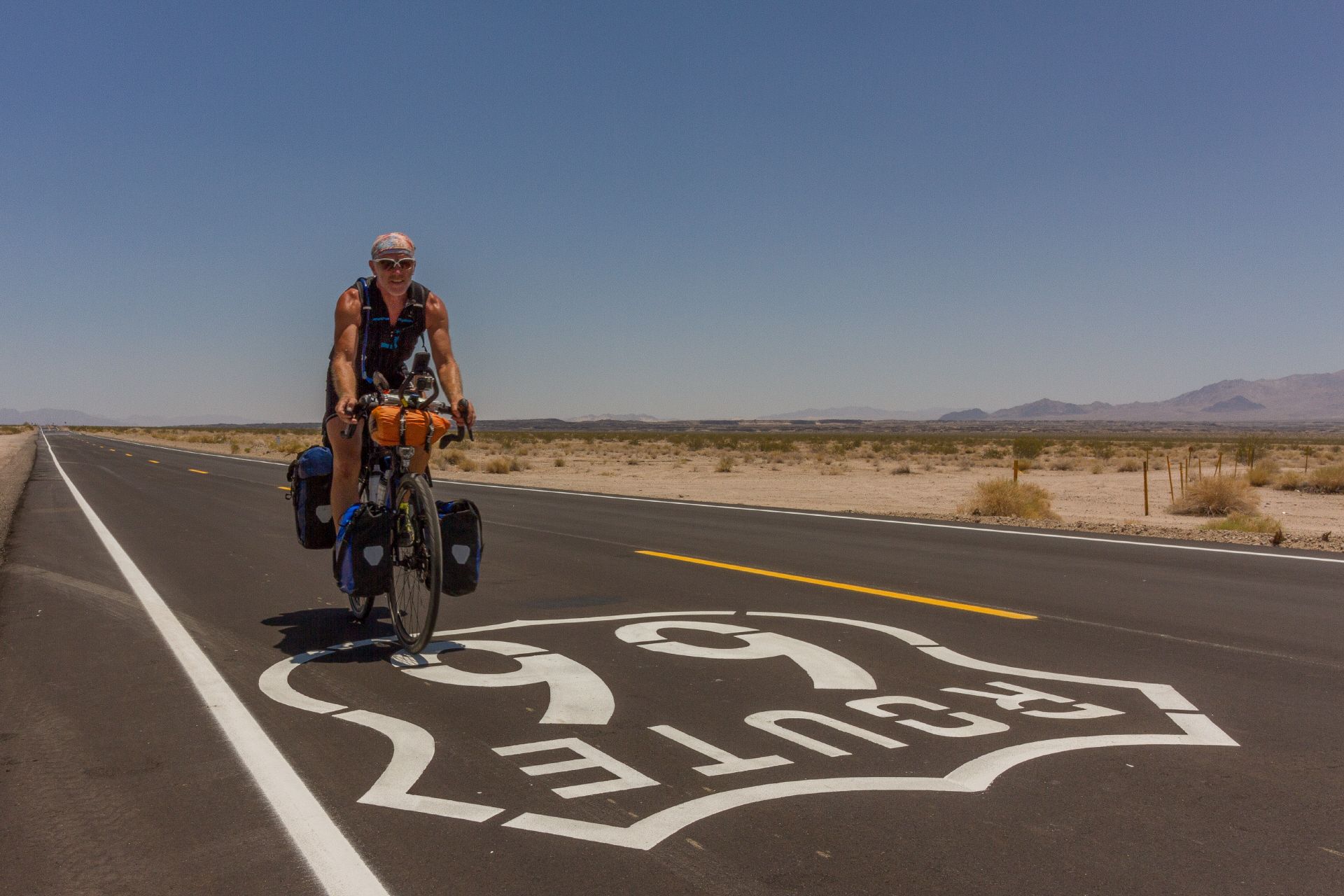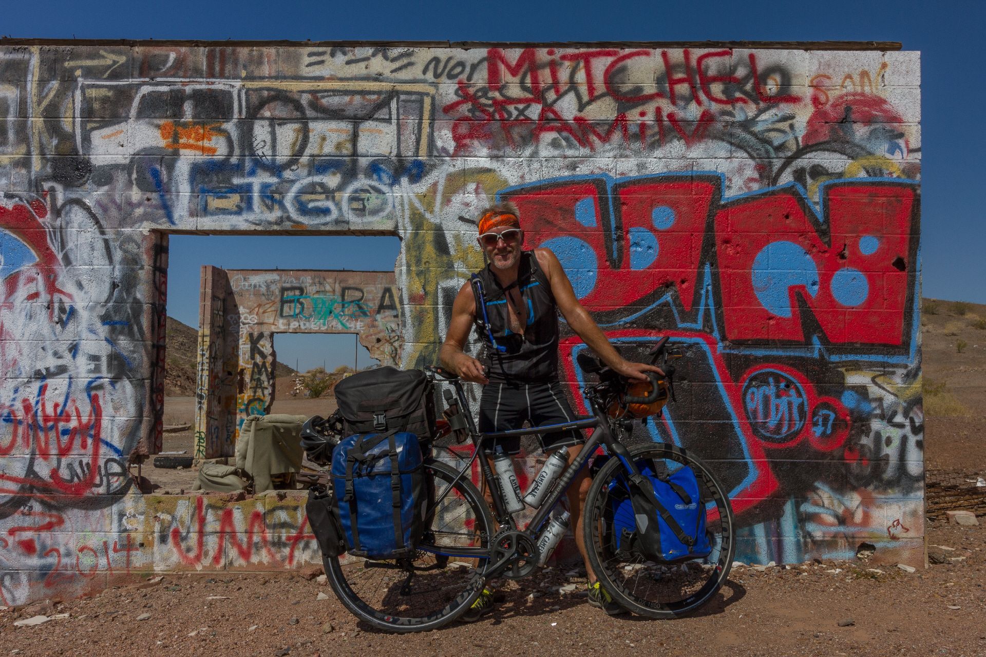 Heute ist die erste lange Wüstenetappe. Deshalb startete ich um 3 Uhr. Und das bei 30 Grad!! Ungewohnt. Etwas komisch und auch unangenehm ist es so bei Dunkelheit zu radeln. Am Anfang ging's auf die Interstate. Bei Exit 133 sollte es dann runtergehen und auf Nebenstraßen weiter. Da es noch komplett dunkel war, bin ich lieber auf der Interstate geblieben. Da fahren wenigstens paar Trucks in der Nacht. Und ich kürze sogar paar Kilometer ab. Es ging dann einiges nach oben. Dass hatte aber den Vorteil, das es kühler wurde. In Fenner, einer Tankstelle mit Oase ging's dann von der Interstate runter. Dort frühstückte ich erst mal. Haben aber stolze Preise dort - alle Achtung. Die weitere Route 66 als Nebenstraße ist wieder als "Very limited services" bezeichnet und ist momentan offiziell wegen Brückenbauarbeiten gesperrt. Als Radfahrer müsste es aber gehen. Also los. Und ja - zwei Brücken fehlten einfach. Aber hier gibt's ja keine Flüsse, also konnte ich die Stellen ganz gut schiebend umgehen. Um 11:30 erreichte ich Roy's Café in Amboy. Das Café war aber eher enttäuschend. Wasser musste ich dort in kleinen überteuerten Flaschen kaufen. Amboy und der gleichnamige Vulkan-Krater liegen ziemlich tief bei ca. 200 m. Deshalb stieg hier das Thermometer auch auf 48 Grad.