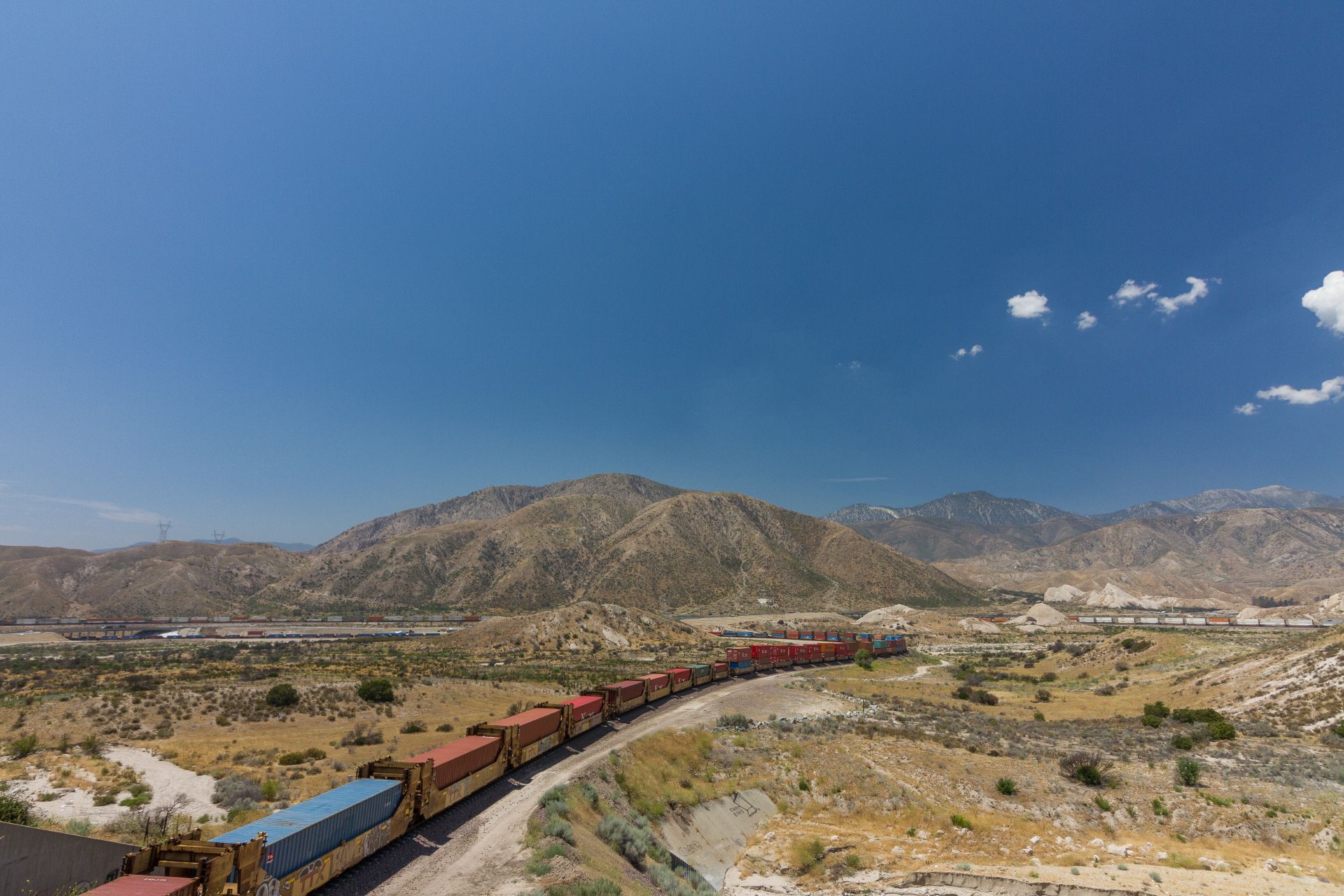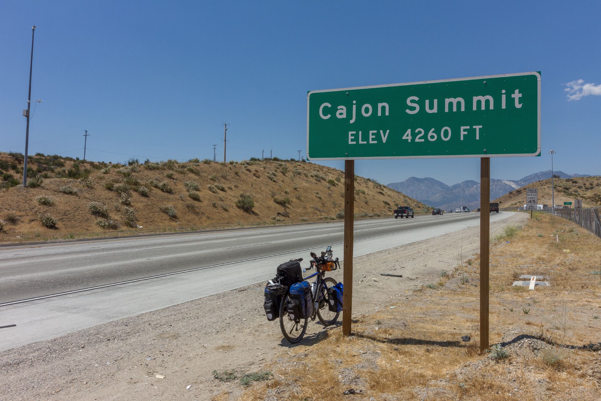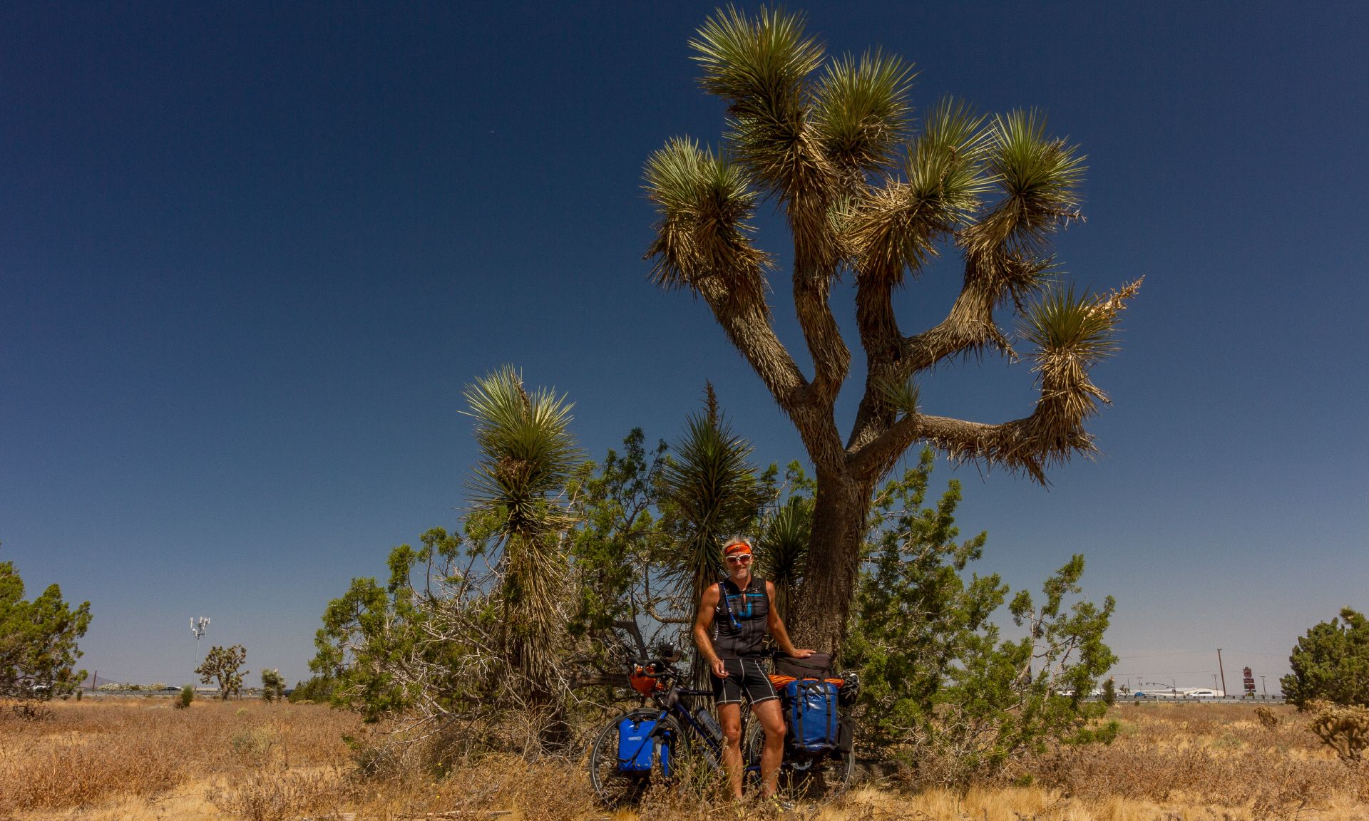 Um 8 Uhr hatte ich auf dem Shady Oasis Campground mein Zelt abgebaut, mein obligatorisches Müsli gegessen und alles wieder auf dem Bike verpackt. Durch das uninteressante Victorville zog es sich dann hin und wechselte nahtlos in den Ort Hesperia. In einem Burger King gab's dann das zweite Frühstück. Nein - kein Burger sondern nur ne Coke und ein Milkshake. Bei der Hitze einfach besser. Unterwegs sah ich die ersten Joshua Trees. Dann ging's sanft aber stetig zur letzten bergigen Erhebung vor L.A. - den San Bernardino Mountains. Aber von wegen Pass, es ging nur ein Stück auf der Interstate über einen Sattel. Das war's. Etwas Brenner-Pass Feeling kam auf, aber höhenmäßig nicht mit den Alpen zu vergleichen. Beeindruckend war jedoch der generelle Verkehrsknotenpunkt der Cajon Junction mit Interstate und der in Schleifen geführten Bahnlinie.