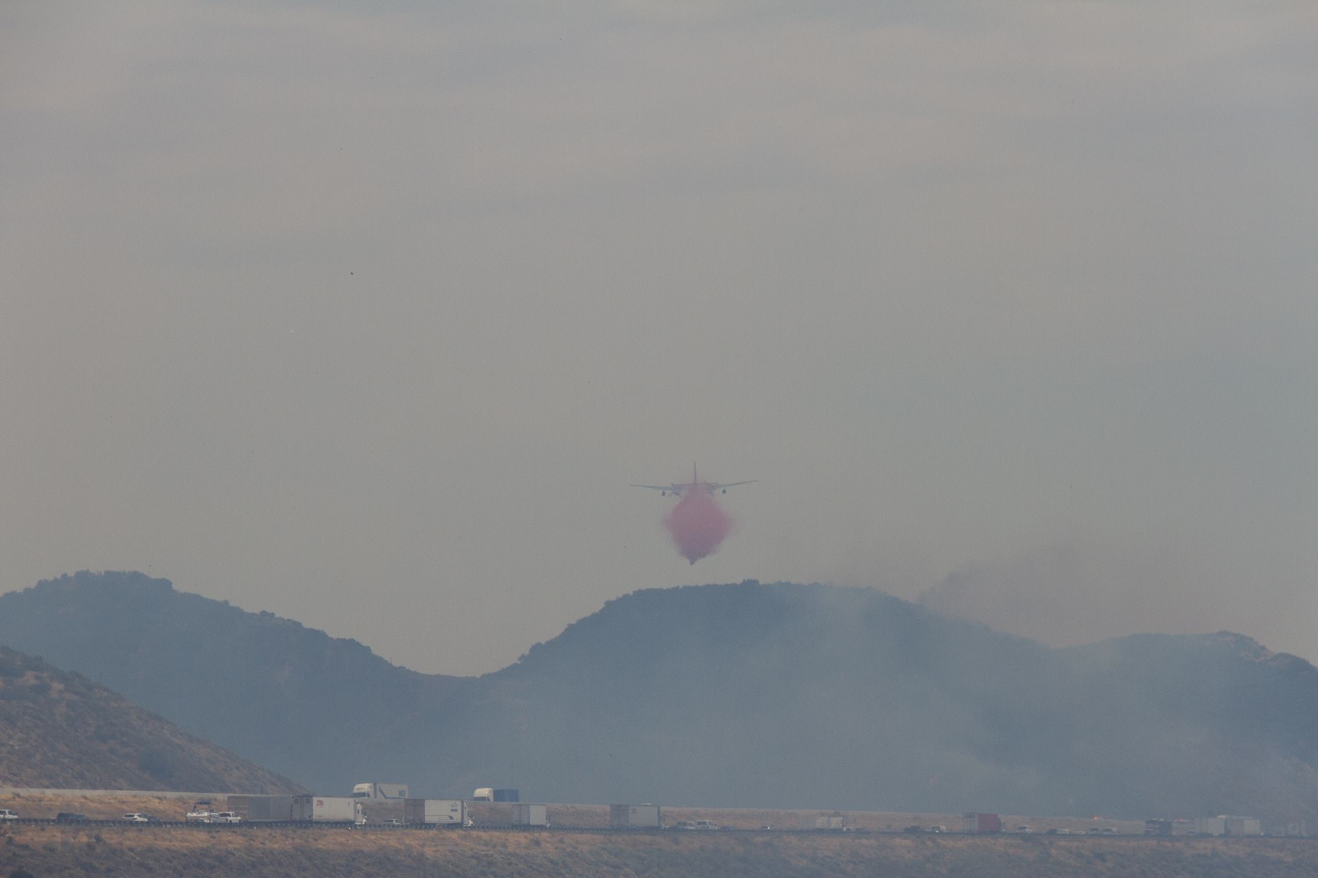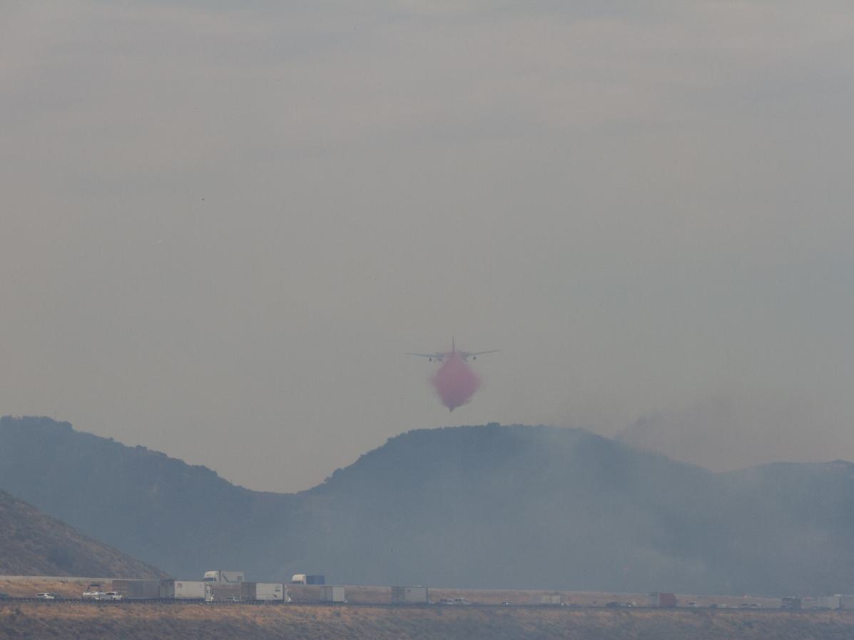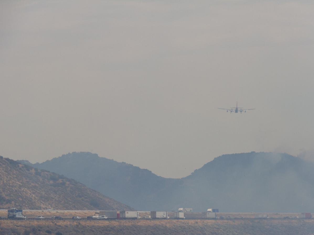 Nach einer kurzen Abfahrt, ging's dann wieder auf die Frontage Road. Nur leider war ich diesmal als Radler nicht allein. Auf Grund eines Buschfeuers gab es einen Stau und viele genervten Autofahrer wechselten auf die Frontage Road. Im Hintergrund konnte man den Qualm und die Lösch-Flugzeuge bei der Arbeit beobachten. Mittlerweile wurde der Qualm immer extremer, so dass ich mir extra ein Schlauch-Tuch feucht machte und mit vor das Gesicht band. Ich habe halt keine Air Condition wie die Autofahrer. Über San Bernardino zog es sich dann hin und ich merkte, der Verkehr wird immer mehr, wird hektischer und stressiger. Nur nicht anstecken lassen, so kurz vor dem Ziel, dachte ich mir. Die Nerven für einige Kilometer in den nächsten zwei Tagen brauche ich noch, denn der Großraum Los Angeles ist gigantisch groß, ohne dass sich eigentlich viel ändert. Die Städte hier sehen alle gleich aus und gehen nahtlos ineinander über. Abgestiegen bin ich heute dann in Fortuna wieder mal in einem billigen Motel 6.