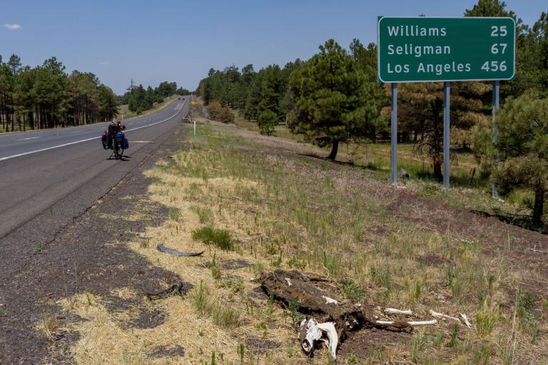 Heute soll's nur bis Williams gehen, dem Knotenpunkt, von dem ich dann den Abstecher zum Grand Canyon vorhabe. Keine große Etappe heute - deshalb erstmal gemütlich in Flagstaff einen guten italienischen Kaffee und ein Bagel genießen. Flagstaff ist schon gechillt. Eine Mischung aus Key West, Banf und Jasper (wenn ihr die Orte kennt). Am Grand Canyon habe ich vor ein paar Tage zu verbringen. Zum Einen wegen der Fotomotive und der Möglichkeit als Hiker/Biker zu campen und zum Anderen warte ich darauf, dass meine spätere Wüstenetappe mit über 170 km passierbar wird. Gestern wurden dort (in Needles) 50 Grad im Schatten gemessen. Laut Wetterbericht soll die Temperatur in paar Tagen leicht nach unten gehen. Die heutige Strecke war zwar kurz, aber ständige starke Gegenwinde und extreme Böen machten diese Etappe doch nicht ganz so einfach.
