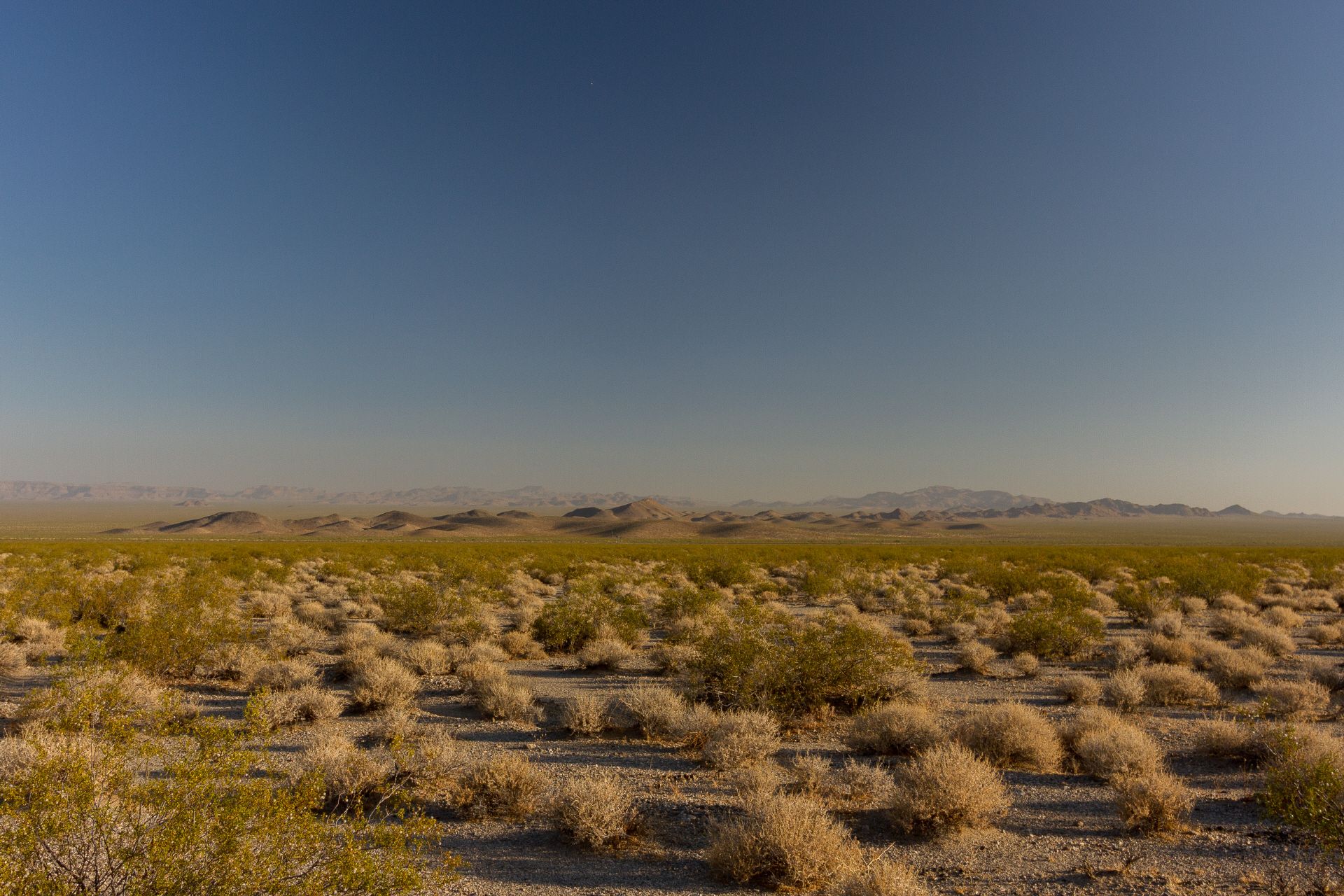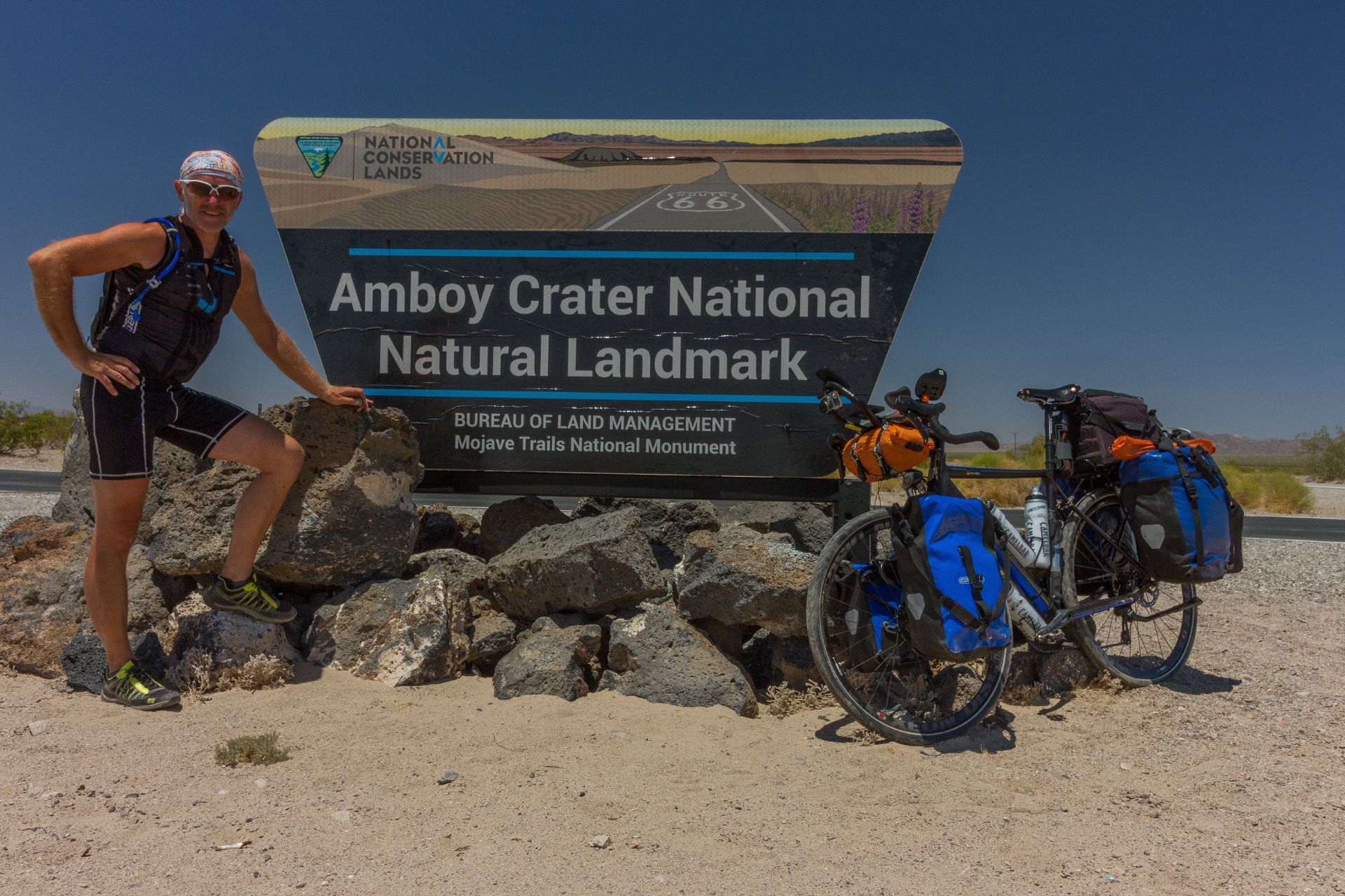 Heute ist die erste lange Wüstenetappe. Deshalb startete ich um 3 Uhr. Und das bei 30 Grad!! Ungewohnt. Etwas komisch und auch unangenehm ist es so bei Dunkelheit zu radeln. Am Anfang ging's auf die Interstate. Bei Exit 133 sollte es dann runtergehen und auf Nebenstraßen weiter. Da es noch komplett dunkel war, bin ich lieber auf der Interstate geblieben. Da fahren wenigstens paar Trucks in der Nacht. Und ich kürze sogar paar Kilometer ab. Es ging dann einiges nach oben. Dass hatte aber den Vorteil, das es kühler wurde. In Fenner, einer Tankstelle mit Oase ging's dann von der Interstate runter. Dort frühstückte ich erst mal. Haben aber stolze Preise dort - alle Achtung. Die weitere Route 66 als Nebenstraße ist wieder als "Very limited services" bezeichnet und ist momentan offiziell wegen Brückenbauarbeiten gesperrt. Als Radfahrer müsste es aber gehen. Also los. Und ja - zwei Brücken fehlten einfach. Aber hier gibt's ja keine Flüsse, also konnte ich die Stellen ganz gut schiebend umgehen. Um 11:30 erreichte ich Roy's Café in Amboy. Das Café war aber eher enttäuschend. Wasser musste ich dort in kleinen überteuerten Flaschen kaufen. Amboy und der gleichnamige Vulkan-Krater liegen ziemlich tief bei ca. 200 m. Deshalb stieg hier das Thermometer auch auf 48 Grad.