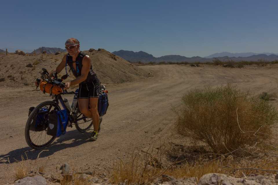 Heute ist die erste lange Wüstenetappe. Deshalb startete ich um 3 Uhr. Und das bei 30 Grad!! Ungewohnt. Etwas komisch und auch unangenehm ist es so bei Dunkelheit zu radeln. Am Anfang ging's auf die Interstate. Bei Exit 133 sollte es dann runtergehen und auf Nebenstraßen weiter. Da es noch komplett dunkel war, bin ich lieber auf der Interstate geblieben. Da fahren wenigstens paar Trucks in der Nacht. Und ich kürze sogar paar Kilometer ab. Es ging dann einiges nach oben. Dass hatte aber den Vorteil, das es kühler wurde. In Fenner, einer Tankstelle mit Oase ging's dann von der Interstate runter. Dort frühstückte ich erst mal. Haben aber stolze Preise dort - alle Achtung. Die weitere Route 66 als Nebenstraße ist wieder als "Very limited services" bezeichnet und ist momentan offiziell wegen Brückenbauarbeiten gesperrt. Als Radfahrer müsste es aber gehen. Also los. Und ja - zwei Brücken fehlten einfach. Aber hier gibt's ja keine Flüsse, also konnte ich die Stellen ganz gut schiebend umgehen. Um 11:30 erreichte ich Roy's Café in Amboy. Das Café war aber eher enttäuschend. Wasser musste ich dort in kleinen überteuerten Flaschen kaufen. Amboy und der gleichnamige Vulkan-Krater liegen ziemlich tief bei ca. 200 m. Deshalb stieg hier das Thermometer auch auf 48 Grad.