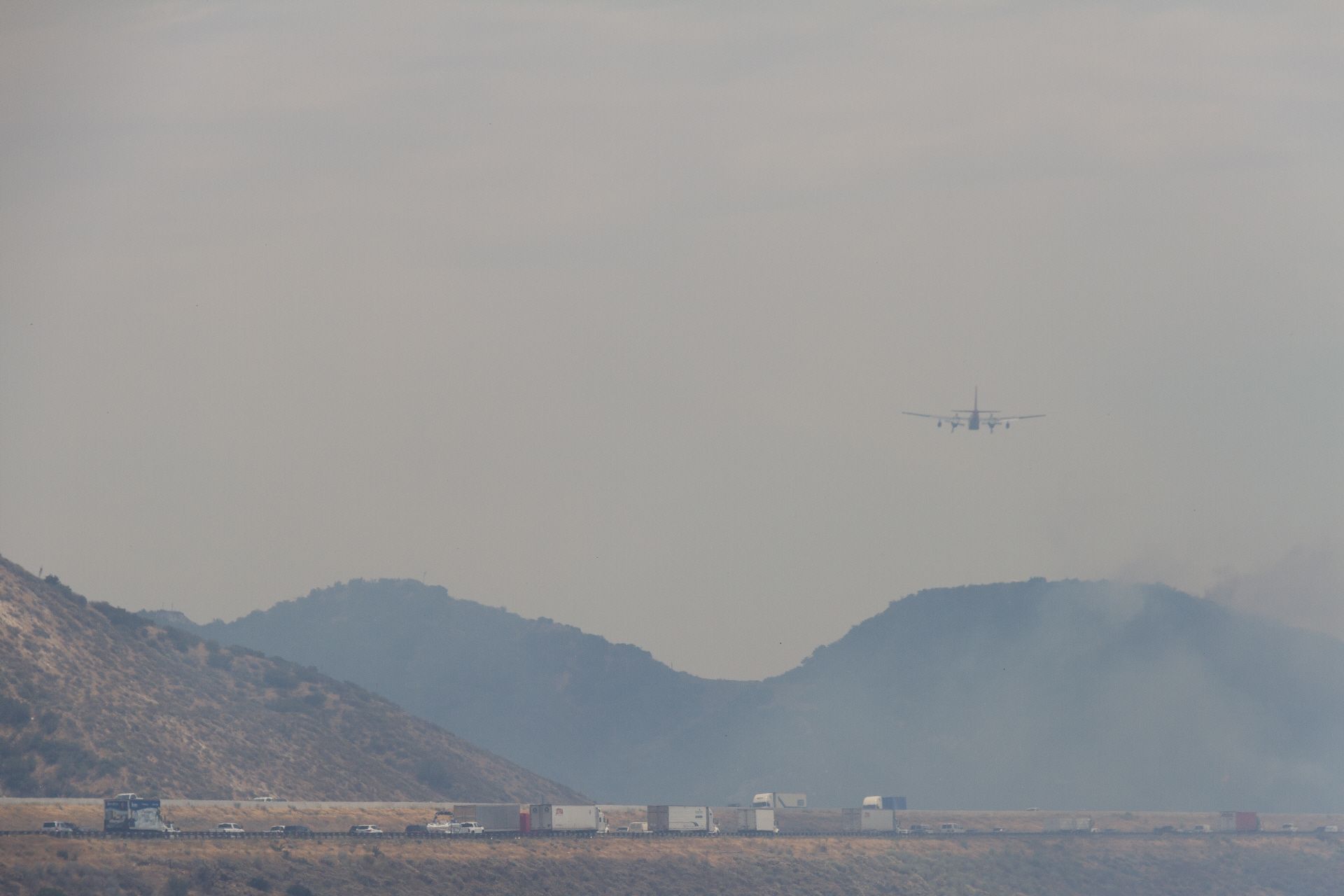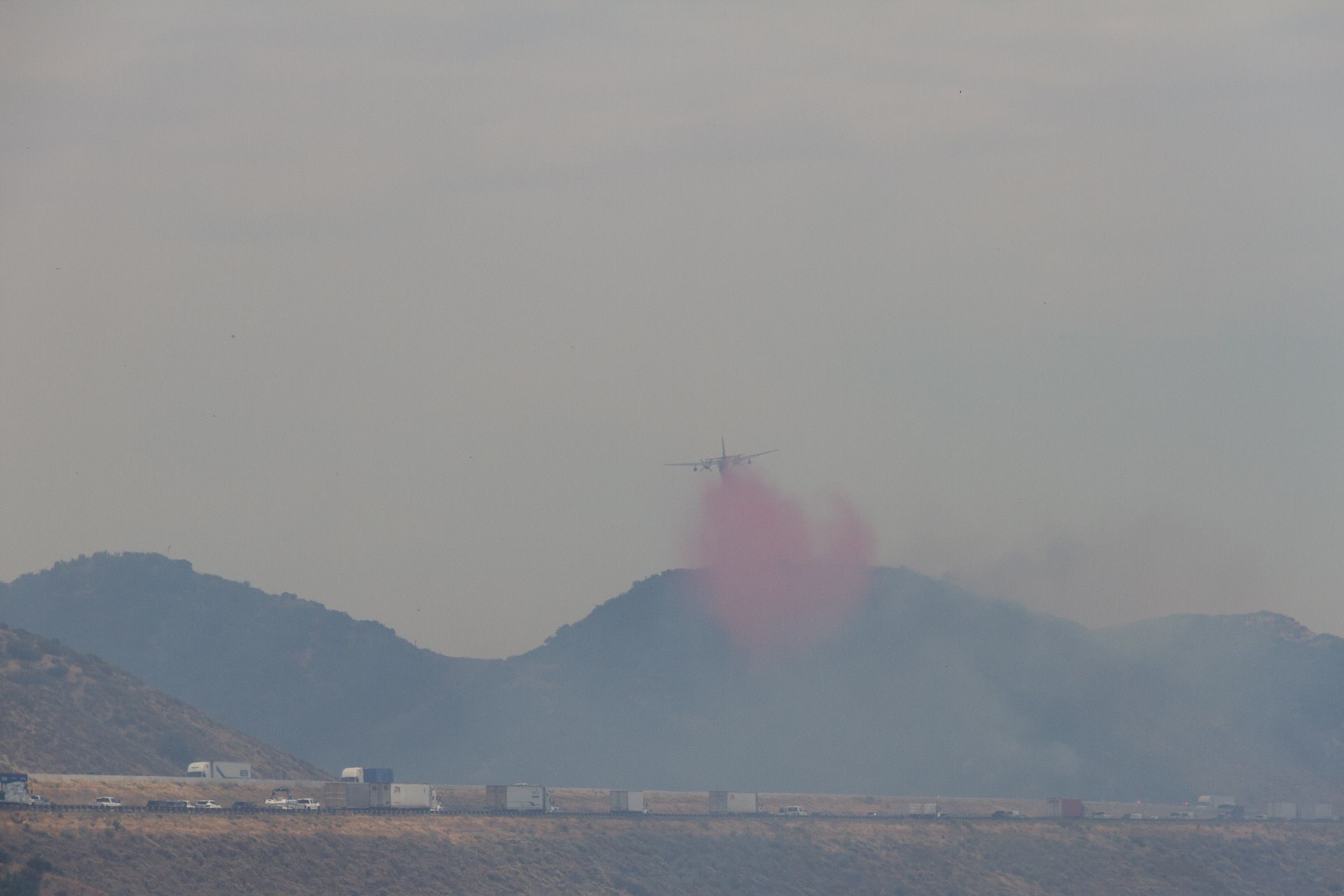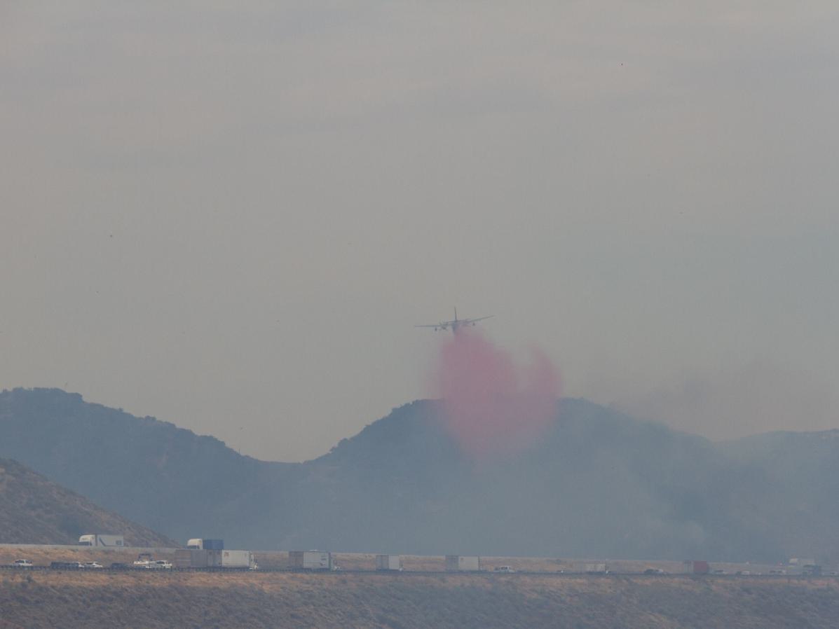 Nach einer kurzen Abfahrt, ging's dann wieder auf die Frontage Road. Nur leider war ich diesmal als Radler nicht allein. Auf Grund eines Buschfeuers gab es einen Stau und viele genervten Autofahrer wechselten auf die Frontage Road. Im Hintergrund konnte man den Qualm und die Lösch-Flugzeuge bei der Arbeit beobachten. Mittlerweile wurde der Qualm immer extremer, so dass ich mir extra ein Schlauch-Tuch feucht machte und mit vor das Gesicht band. Ich habe halt keine Air Condition wie die Autofahrer. Über San Bernardino zog es sich dann hin und ich merkte, der Verkehr wird immer mehr, wird hektischer und stressiger. Nur nicht anstecken lassen, so kurz vor dem Ziel, dachte ich mir. Die Nerven für einige Kilometer in den nächsten zwei Tagen brauche ich noch, denn der Großraum Los Angeles ist gigantisch groß, ohne dass sich eigentlich viel ändert. Die Städte hier sehen alle gleich aus und gehen nahtlos ineinander über. Abgestiegen bin ich heute dann in Fortuna wieder mal in einem billigen Motel 6.